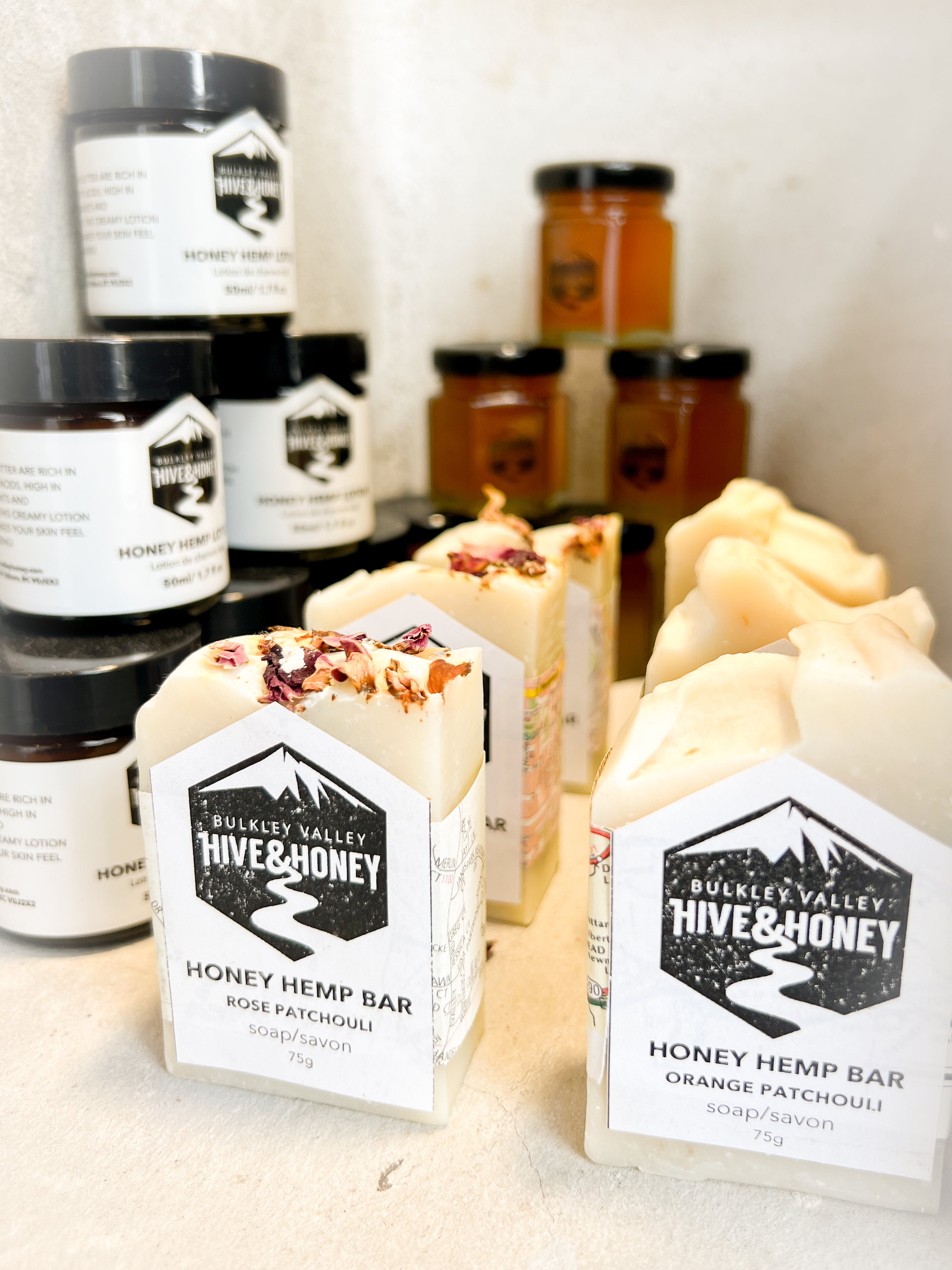The hemp lotion is made with hemp oil and hemp butter, which are naturally rich in Omega-3 and Omega-6 and full of skin-loving antioxidants. It’s gentle, nourishing, and great for everyday use. The soap is scented with Palmarosa and Rose Geranium to soften the patchouli and bring out its natural floral notes, giving it a warm and inviting aroma.